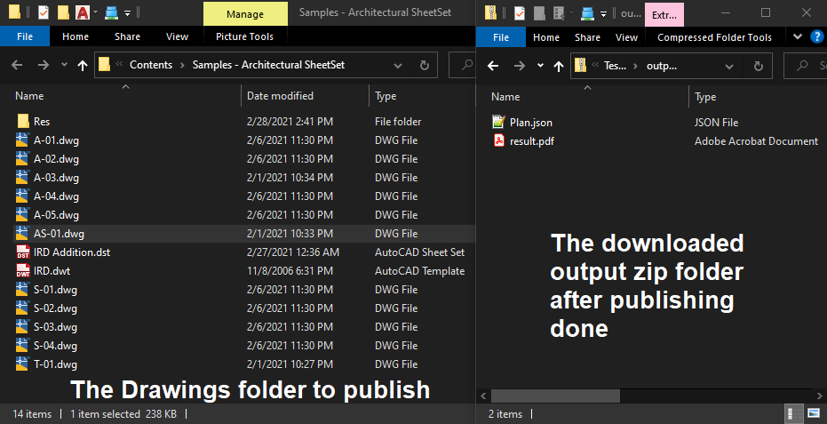 At initial start, the [Drawings] textbox is automatically filled with a direct link to a sample drawings folder. You can just click [Run Publish] and see how the publishing command processes.
