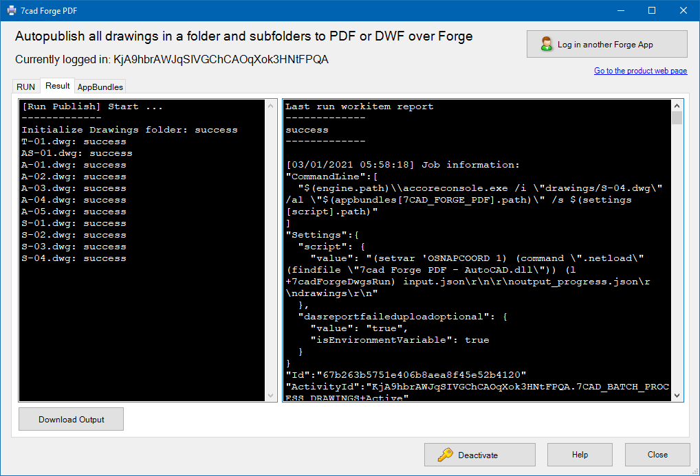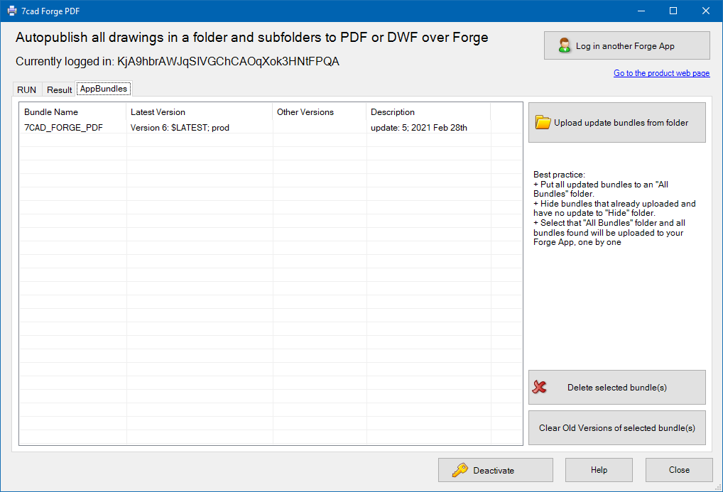 + After select drawings, select plotter, click [Run], the app will install itself as an "app bundle" to the server under your Forge App account. Switch to the AppBundles tab and you can see the 7CAD FORGE PDF bundle in the list.