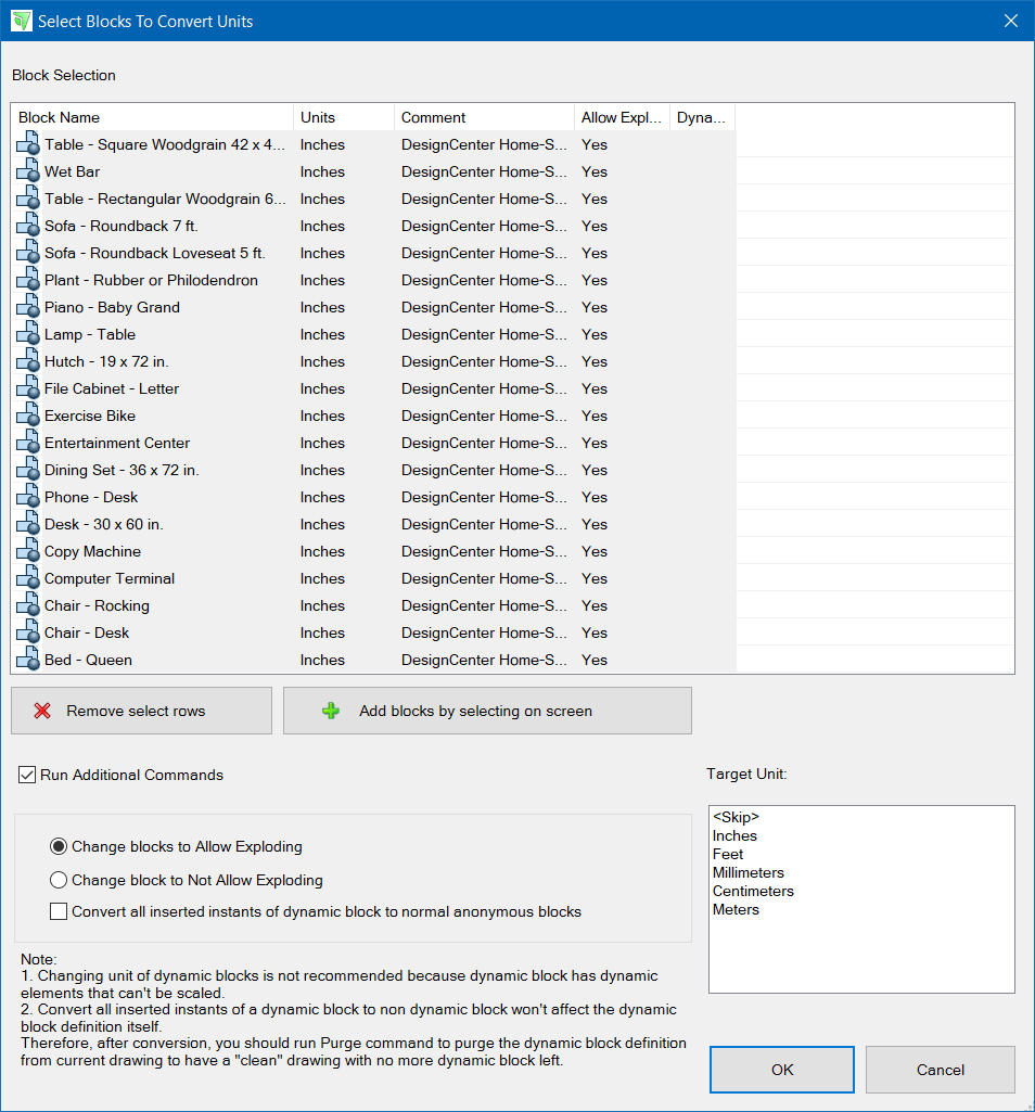 + Change Block Units: select blocks and change their block units, allow exploding property, and/or convert them from dynamic blocks to normal static blocks.