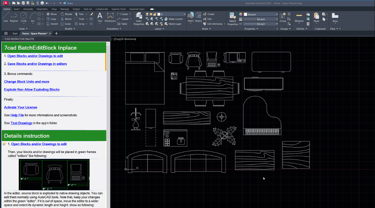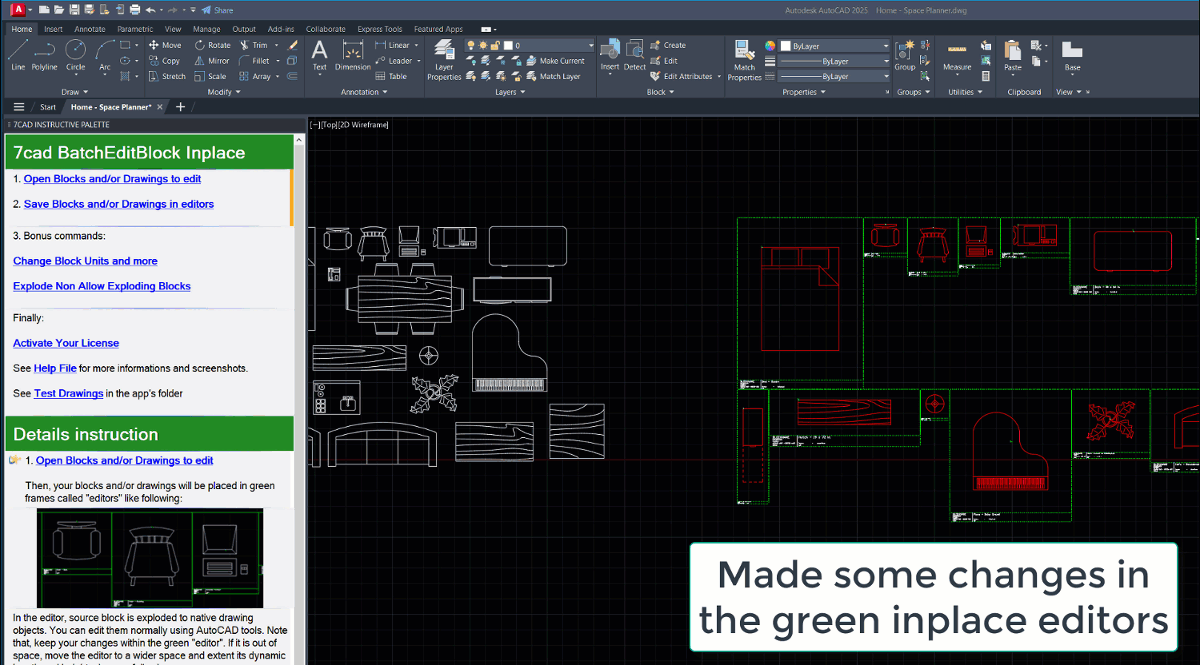 + In the editor, source block is exploded to native drawing objects. You can edit it normally using AutoCAD tools. Note that, keep your change within the green frame "editor". If it is out of space, move the editor and its content to a wider space and extent its dynamic length and height.
