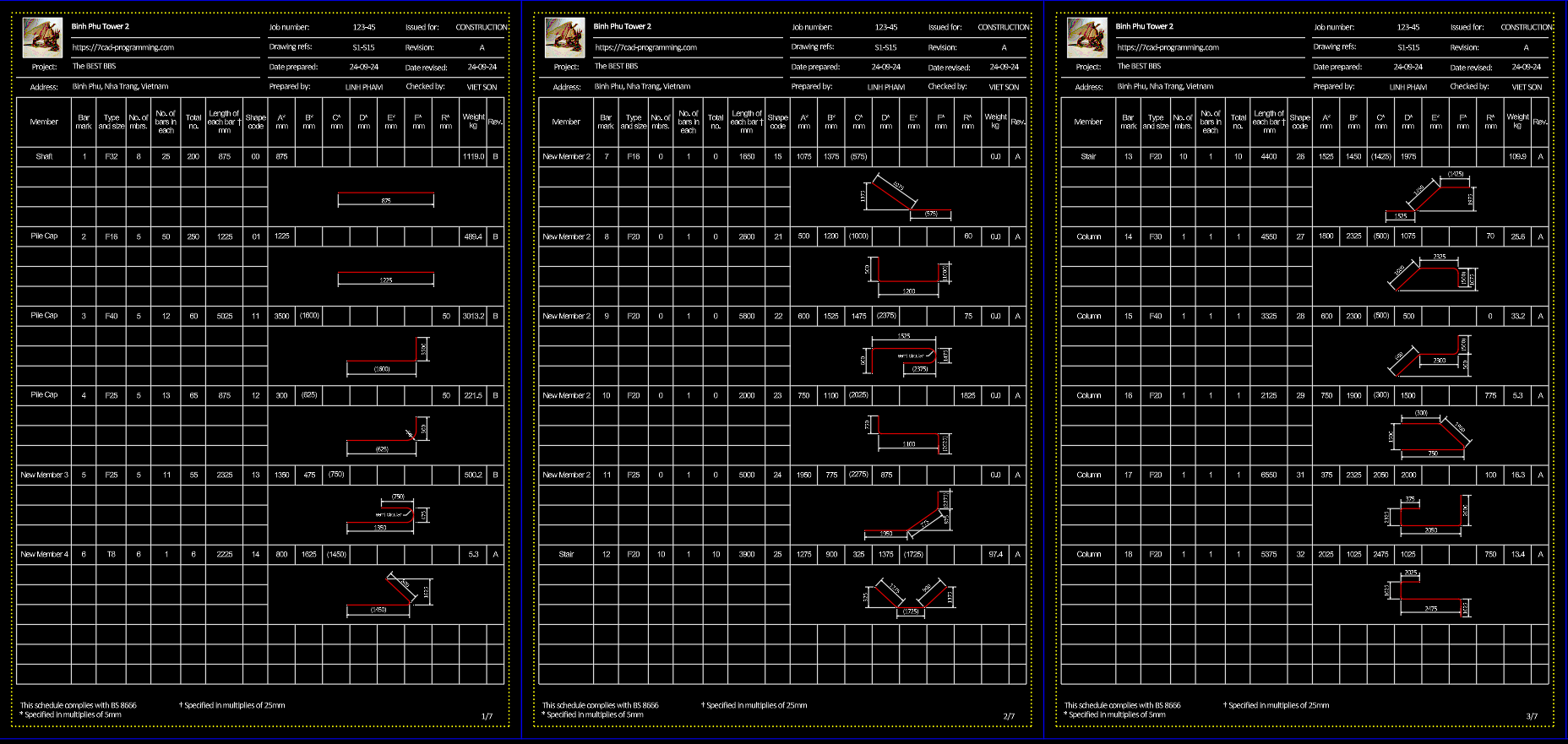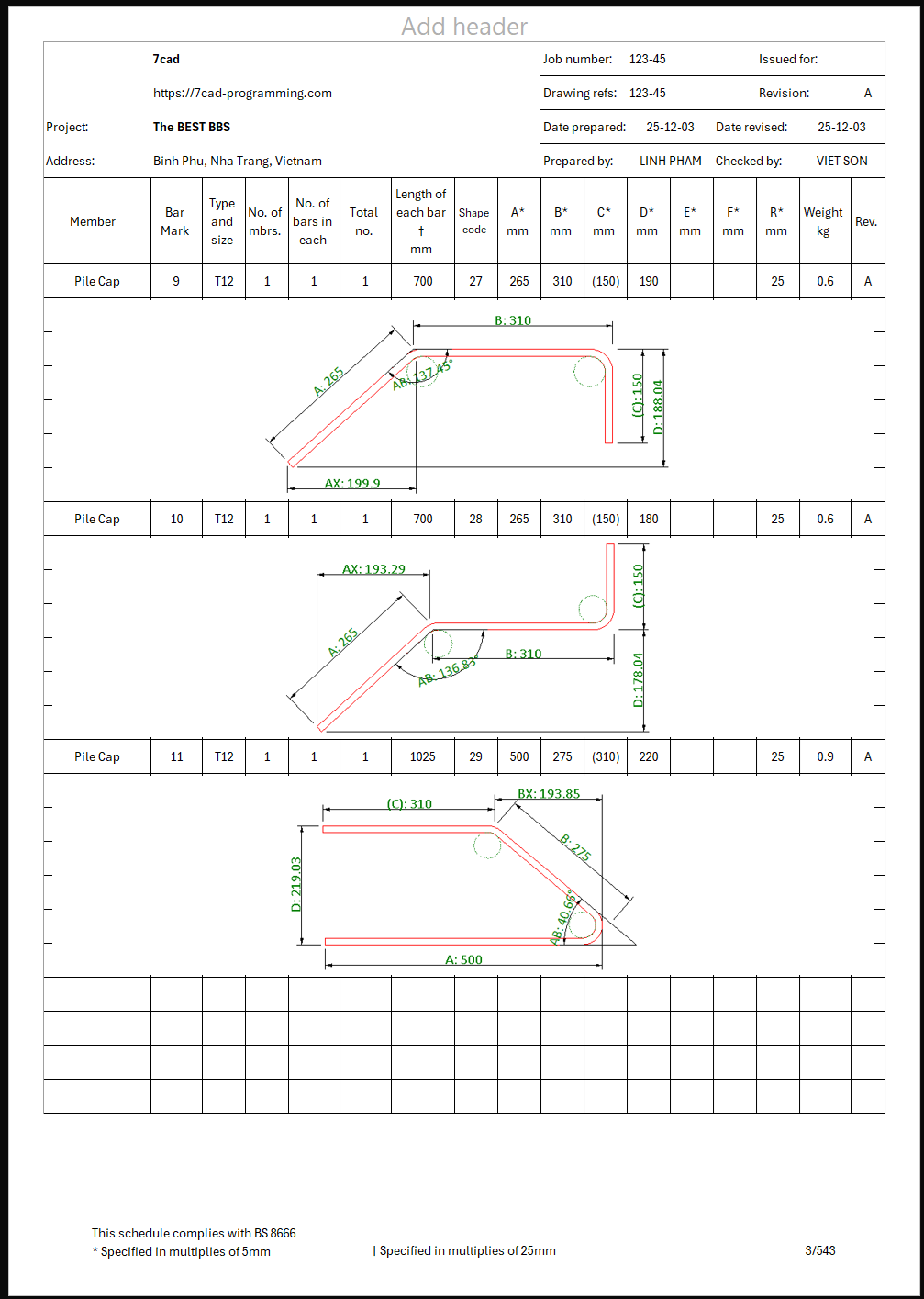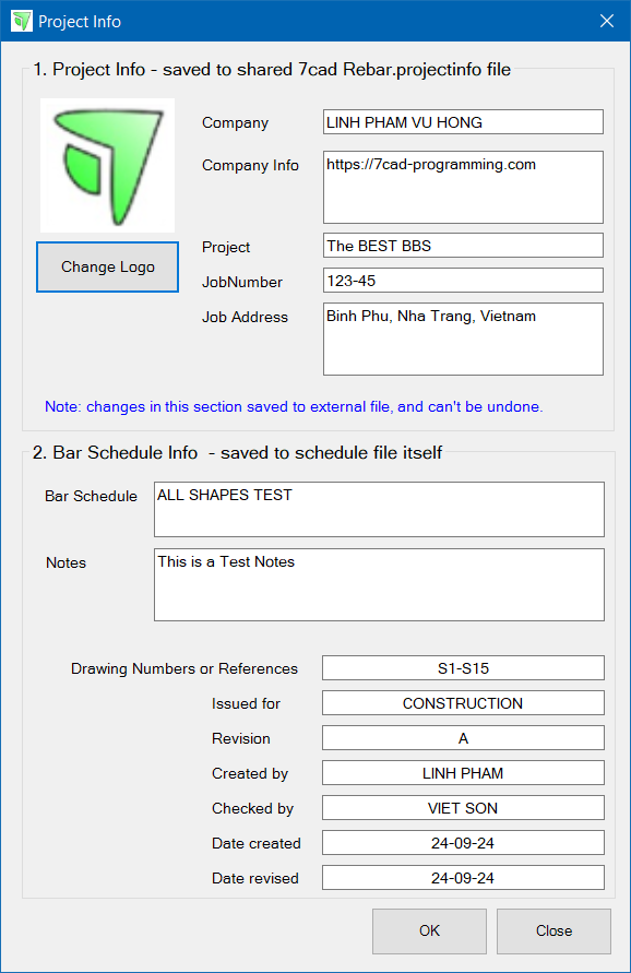 1.3 Project info: Project info first part is saved to 7cad Rebar.projectinfo file in your working folder. Therefore, changes in project info's company name, company logo, project name, etc. will be populate to all rebar schedule within the working folder. On the other hand, Project info second part, like drawing number or references, revision, created by and checked by etc., are saved to the rebar schedule document itself.