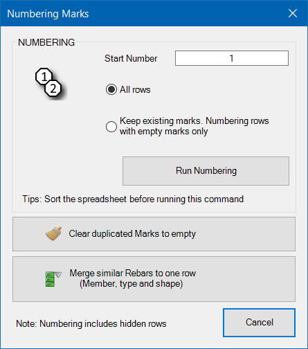 Generate Marks command window: see in screenshots. You can renumber all marks with a click on the "Run Numbering" button.