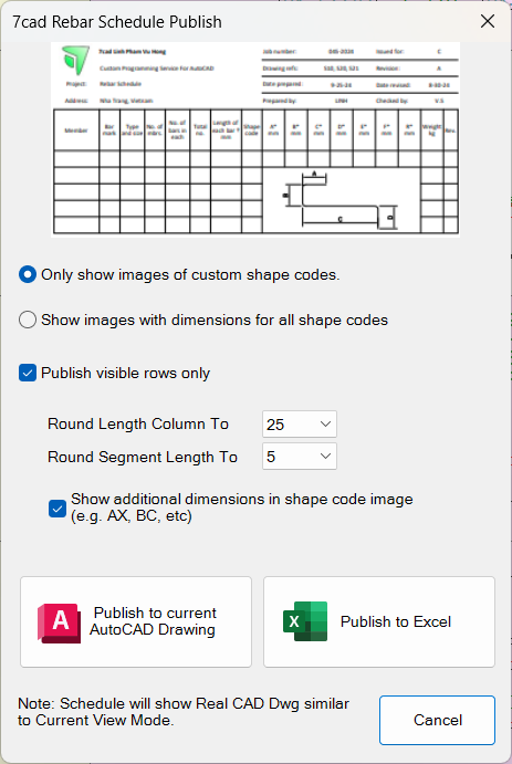 Publish commands: you can publish the rebar schedule to AutoCAD or Excel for print. If current view mode is showing Real CAD Dwg, then the publishing result will show real cad drawing. If current view mode is not Real CAD Dwg, publishing result will show the shape code definition images.
