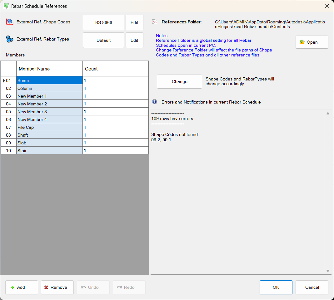 1.2 References folder: This folder contains ".shapecodes" and ".rebartypes" files, which are external reference files. Change this folder location will affect all your rebar schedules in your PC. By default, References folder is the app's content folder. If you customize shapecodes and rebartypes files, you should save them to a shared folder and set it as References folder so all your users can access the same references files.