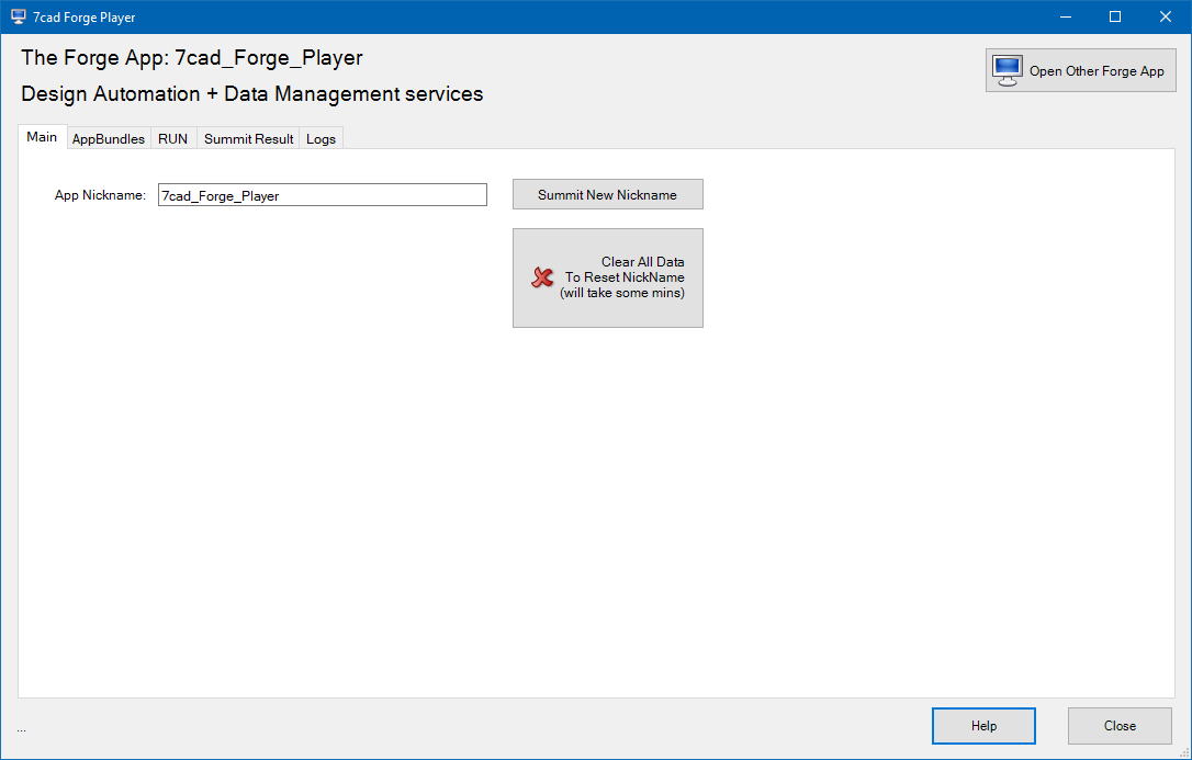 Click [Open App], then enter your app's ID and secret code for 7cad Forge Player connect with your Forge app.
