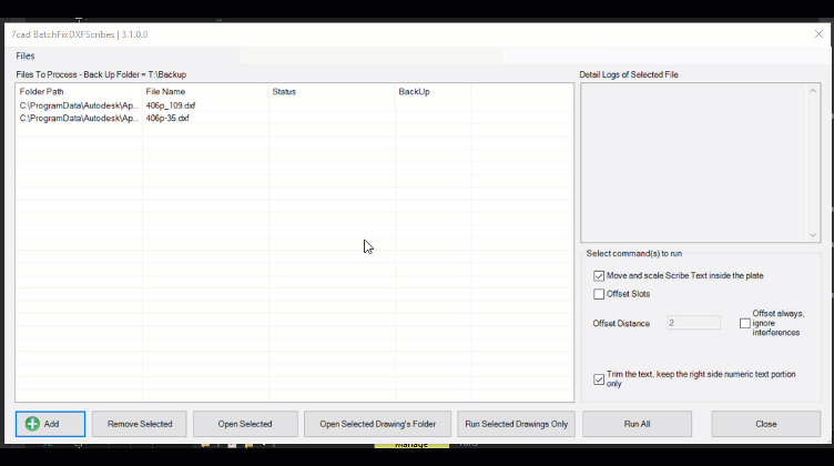 The process runs just silently in the background. There is a log window on the upper right panel for you to get log info on selected drawing, after "Run" clicked. But if you want to really see the action, you can open 1 dxf drawing by click "Open Select" and click "Run Selected Drawings Only". See "Offset slots action" and "Fix scribe text action" screenshots below to understand how it work before decide to process all drawings with "Run All".
